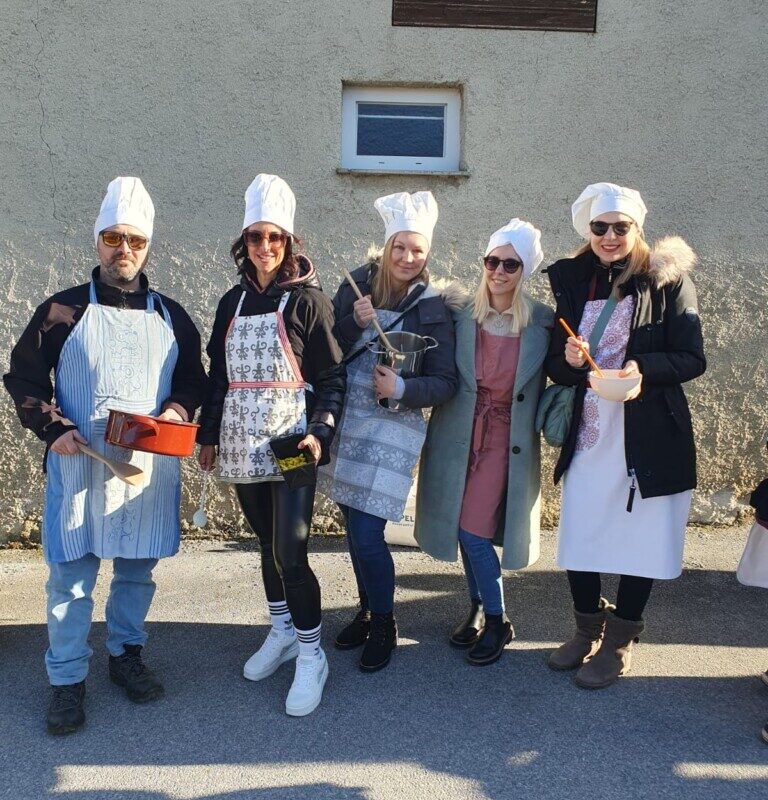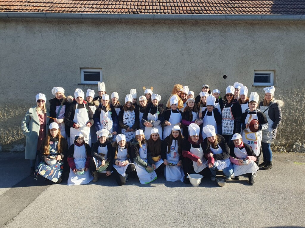 “Für das nötige Salz in unserer Hauskirchner Faschingssuppe sorgen heute die lustigen Köchinnen und Köche der Mittelschule Neusiedl. Fast Food Restaurants müssen sich ab heute verstecken, wenn unsere Spitzenköchinnen den Tisch decken. Im Takt kochen und singen sie sogleich, da werden selbst die Haubenköche kreidebleich. Sehen Sie heute: die Vorbereitung zum Kuchen backen!”