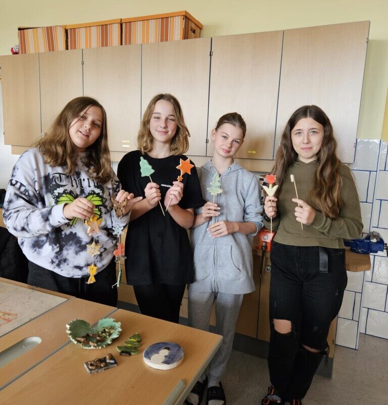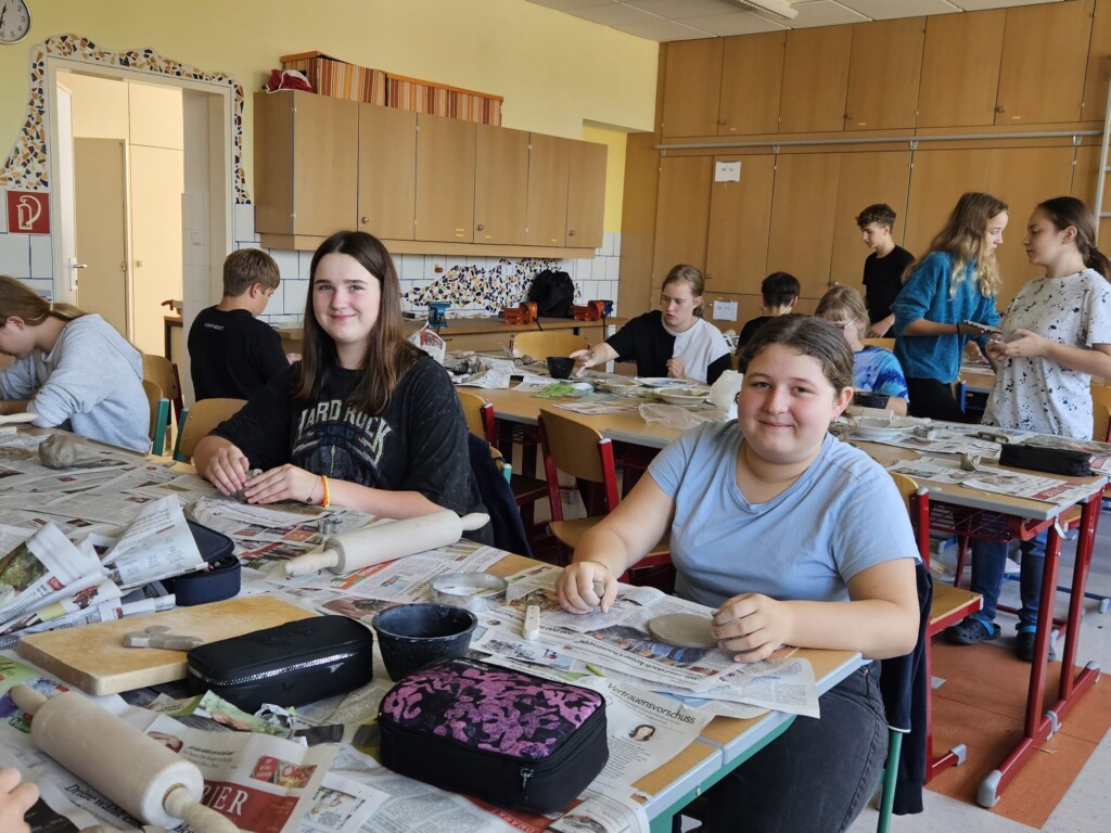 Im Rahmen des Wahlpflichtfaches Kreativ beschäftigten sich die Schülerinnen und Schüler der beiden 3. Klassen vom Schulbeginn bis in den Spätherbst mit dem Herstellen von Keramikartikeln. Sie formten kleine Kunstwerke aus Ton und glasierten diese nach dem Schrühbrand. Anschließend wurden die Stücke ein zweites Mal gebrannt. Nun sind alle Werke fertig. Die kleinen Kunstwerke können wirklich sehen lassen.