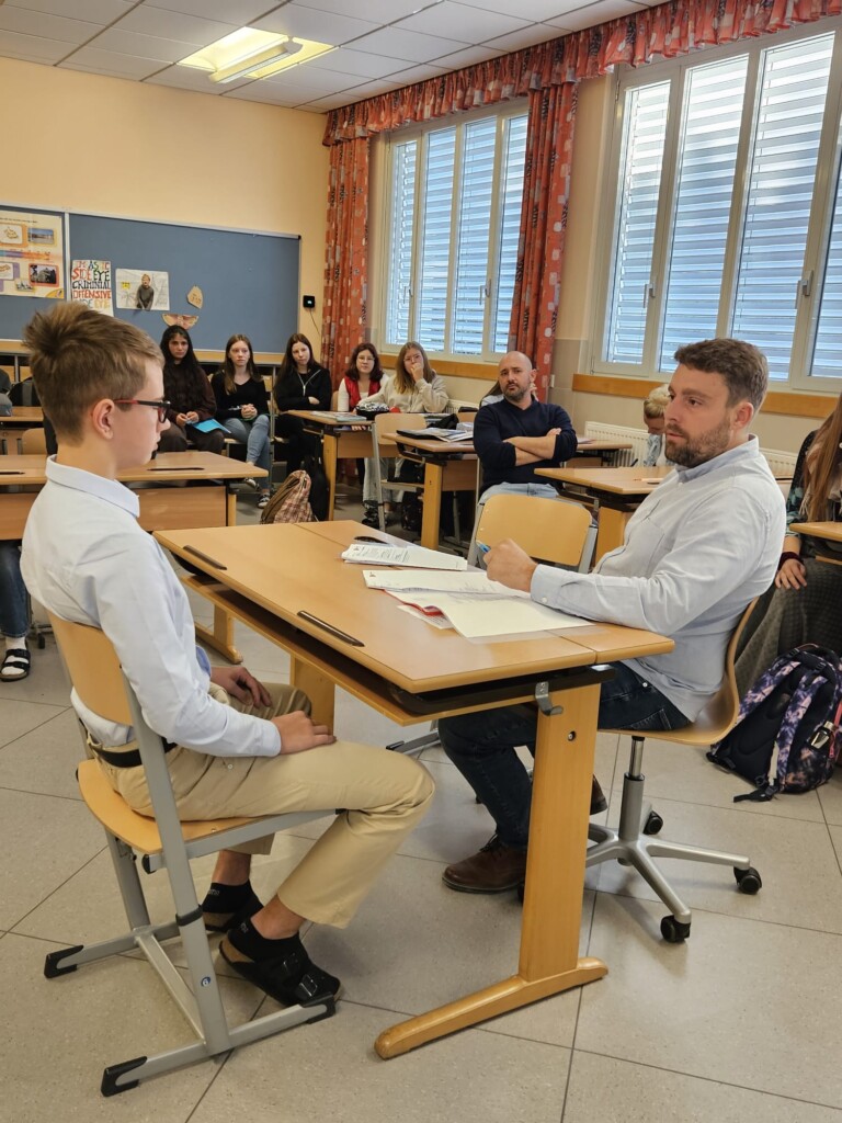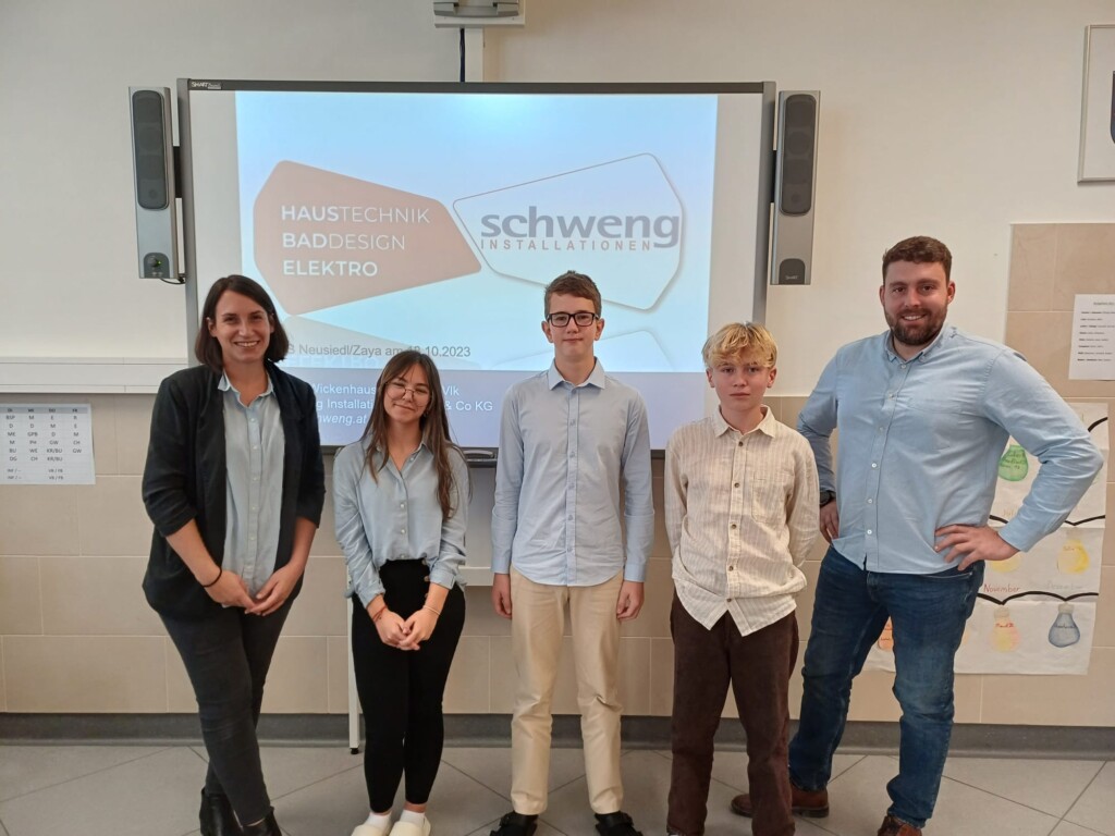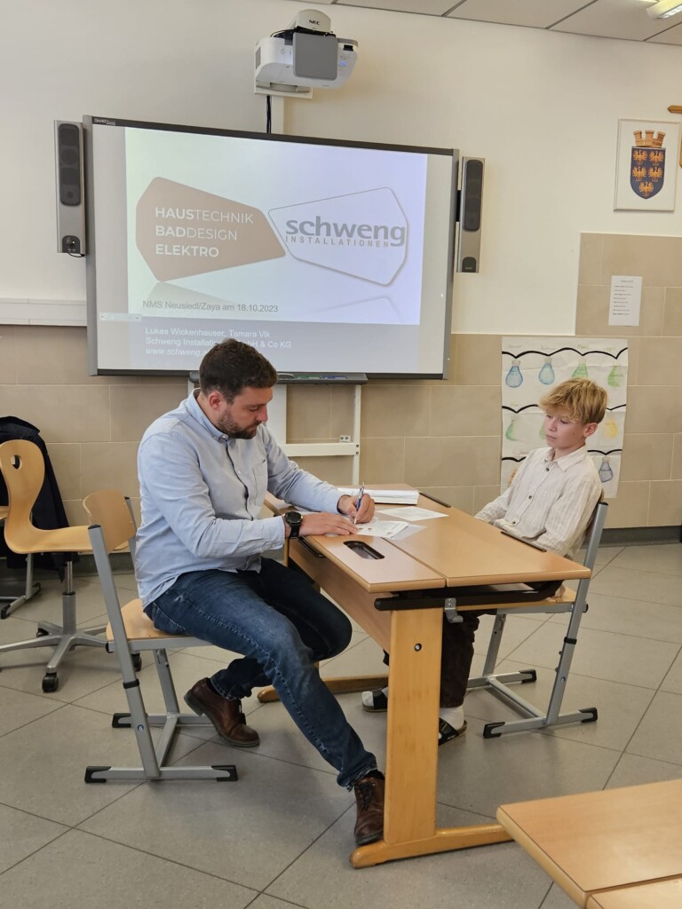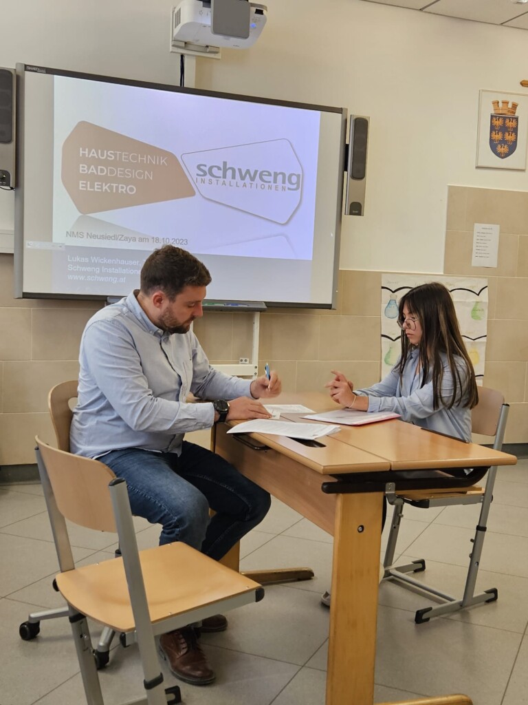 „Bildungswege, Berufe und Bewerbungen“ war das erste große Lernthema in den beiden 4. Klassen im Fach Deutsch. Dazu gehört neben einem Bewerbungsschreiben samt Lebenslauf auch, sich auf ein Bewerbungsgespräch vorzubereiten. Damit die Schülerinnen und Schüler das Gefühl bekommen, wie ein Bewerbungsgespräch in „Echt“ abläuft, erklärten sich Lukas Wickenhauser, der Geschäftsführer von der Fa. Schweng Installationen und Tamara Vlk, ebenfalls Fa. Schweng Installationen bereit, dies mit den jungen Leuten zu trainieren. Geschäftsführer Wickenhauser gab zahlreiche Tipps, wie ein Bewerbungsgespräch gut gelingt. Zwei Schüler und eine Schülerin wagten es schließlich und simulierten Bewerbungsgespräche. Leonard Girsch (4b), Sudem Cihan (4b) und Jakob Fallnbügl (4a) setzten perfekt das Gelernte in die Praxis um
